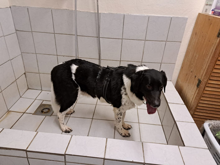 Nach unzähligen Jahren und unzähligen Versuchen, unsere Fellnasen davon zu überzeugen, das ein (Voll)bad nach den Spaziergängen manchmal einfach alternativlos ist, kommt der kleine Lenny und geht bei dem zweiten Gang ganz von alleine in die Hundedusche und schaut uns fragend an, was es denn endlich losgeht mit der Säuberung.