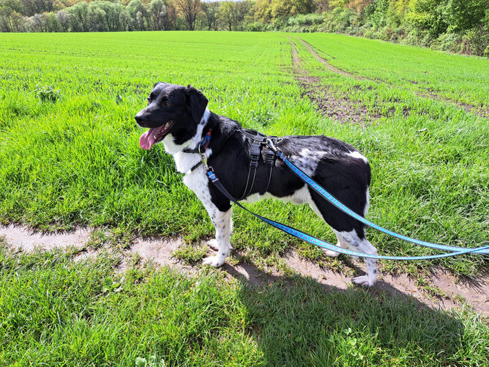 Auch seine ersten Spaziergänge hat er schon gemeistert. Dabei ist er noch sehr aufgeregt und unsicher, aber mit jedem Spaziergang gewinnt er mehr Selbstvertrauen und wird hoffentlich bald voller Freude über die Felder flitzen.