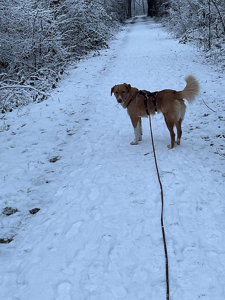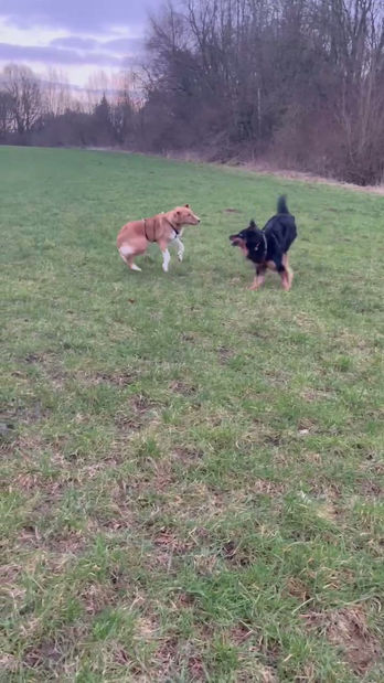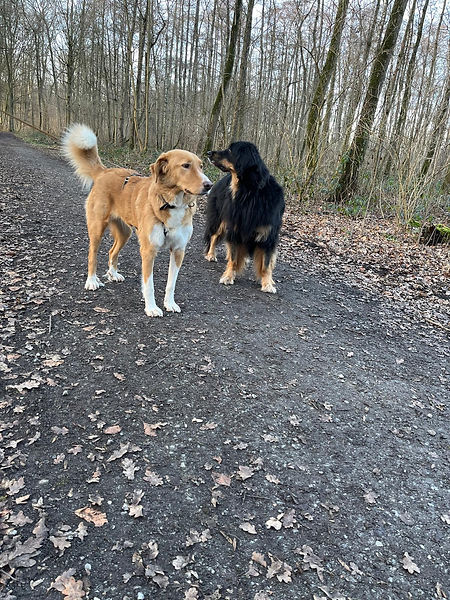 Mittlerweile hat sie auch alle Hunde im näheren Umfeld kennengelernt - hier auf einem Spaziergang mit Skyler.