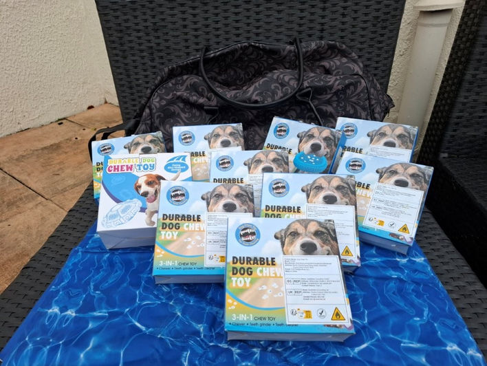 Gleich eine ganze Wagenladung voller hochwertigem Tierarzt-Futter für Hunde und Katzen, Hundespielzeug und viele Leinen, Geschirre und Halsbänder.